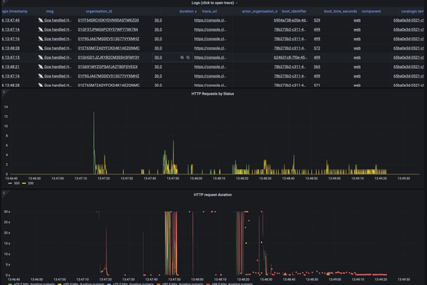 今年早些时候,当我们与数据库互动时,我们的应用程序在两周的时间里出现了间歇性的超时问题。尽管我们尽了最大的努力,但我们不能立即确定一个明确的原因;我们并没有进行任何明显改变数据库使用方式的代码更改,也没有突然的流量变化,我们的日志、追踪或仪表板中也没有任何警告性的内容。在那两周内,我们部署了24个不同的以性能和可观测性为重点的更改来解决这个问题。在这篇文章中,我将分享一些关于这些更改是什么以及我们从中获得的价值。当我们注意到这些减速并收到一个客户的报告,以及在我们的错误报告工具Sentry中看到了大量的“context canceled”错误后,我们首先对这些减速进行了调查。我们的值班工程师,Aaron,启动了一个事件并开始进行调查。他打开了我们在Grafana中的API仪表板,该仪表板提供了我们API健康状况的高级概览。他确认我们确实在某些API请求上超时了,但在一分钟之内,我们已经恢复了正常服务。