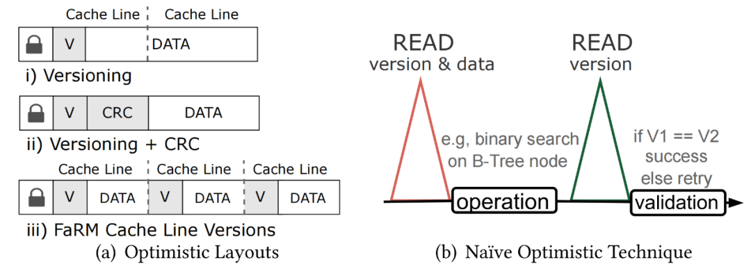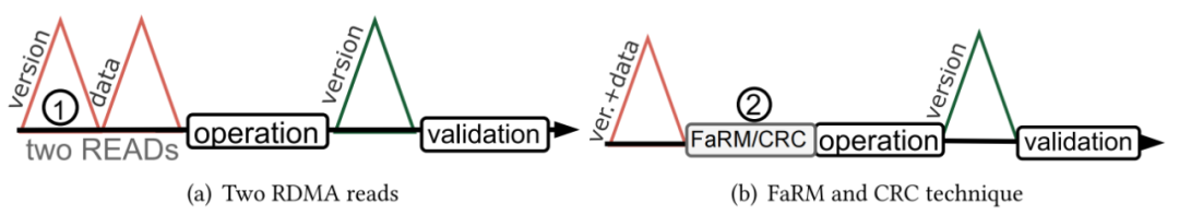 CRC+版本控制。该方案通过使用数据校验和来检测不一致性,例如,CRC64,允许工作线程以高概率正确的方式验证数据。如果有并发写入,则损坏的数据不匹配CRC。因此,在最好的情况下,只需一次 RDMA 读取。然而,缺点是(1)CRC的生成是通过计算来实现的,代价昂贵并且(2)它只是基于概率性的。 给每个缓存行附加一个版本信息,从而规避一个额外的专门读取版本与闩锁信息的RDMA操作。附加的代价就是需要检测每个缓存行的版本信息是否一致以及额外的存储空间。