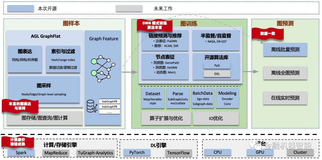 灵活可扩展的图样本生成:基于 Spark 支持大规模图数据k阶邻域生成,解除图学习任务中的数据依赖问题;支持丰富的图类型,如同质、异质、动态等图数据类型;抽取子图过程,支持灵活丰富的过滤与采样能力;支持点/边/图多个级别的图样本生成,并通过统一的 GraphFeature 进行表达。 简洁易用的图训练与图预测:因预先生成的图样本解决了数据依赖问题,用户可以使用像使用 DNN 的方式一样训练 GNN ,入门简单;使用统一的数据格式表达和解析不同类型,不同级别的图样本,用户只需简单的配置就能支持读取和解析相应的图样本,获得模型所需的点/边 特征矩阵,邻接矩阵等信息,方便易用;图预测过程可以直接使用图样本生成阶段已经生成好的样本,保证训练和预测阶段图样本的一致性。 丰富的图学习算法:用经典的 Encoder-Decoder 范式描述算法建模过程,并进行图卷积层、图算法层、图模型层的划分,可复用性强;提供提供一系列经典的开箱即用且业务实践应用过的算法,涵盖异质/同质/动态图等不同算法,对应节点表征/链接预测/自监督等多种任务;适配开源算法库,减轻开发负担;