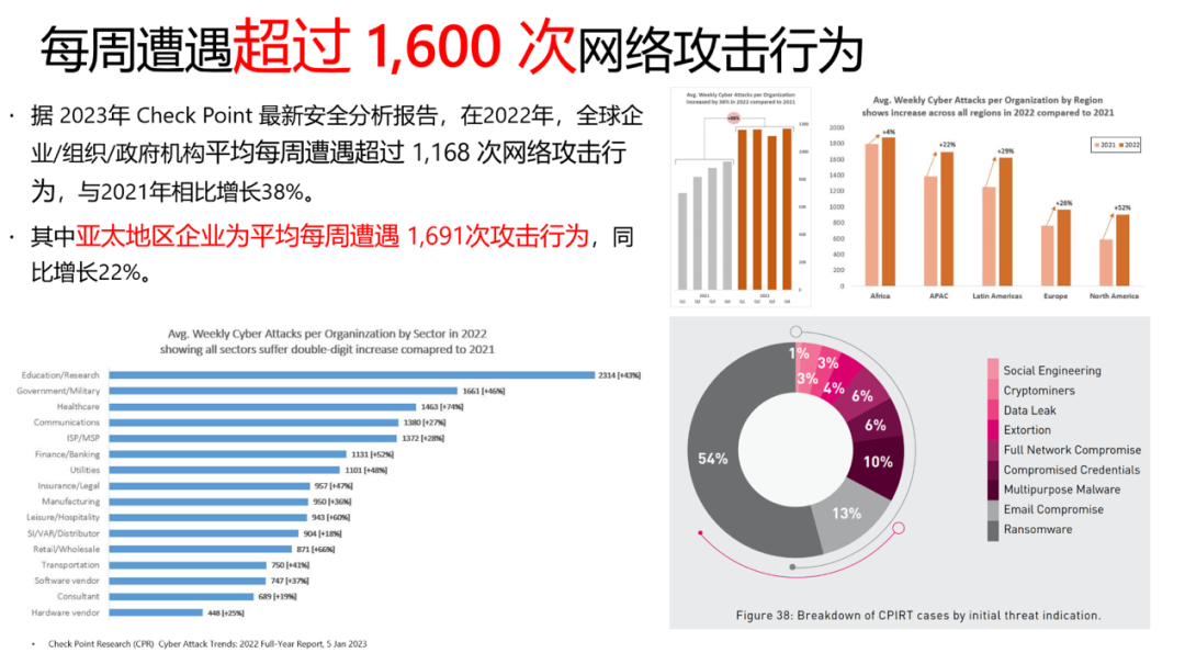 “你见、或者不见我,我就在那里,不悲、不喜”,这句深情款款的诗,却道出了网络安全威胁的本质:它是无时无刻、无处不在的。据 2023年 Check Point 最新安全分析报告,在2022年,亚太地区的企业/组织/政府机构平均每周遭遇 1,691 次攻击行为。这是一个非常高的数据,从中可以充分揭示我们现在面临的网络安全威胁态势的严峻性。