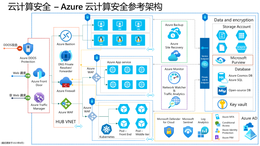 在这个 Azure 云计算安全参考架构中,包含了以下 Azure 云计算服务的核心(并非全部)基础安全最佳实践: