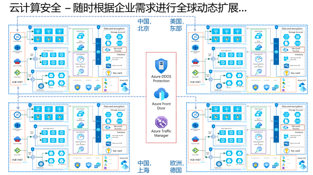 并且这个云计算安全参考架构是一个全球统一的架构,我们可以在全球不同的 Azure 区域、不同的租户、或者租户内部的不同订阅、不同网络中参考这个安全参考架构进行安全架构部署,并构建全球互联互通的统一网络架构,如下图所示:
