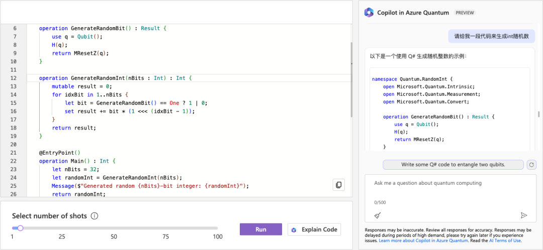 Q# 需要首先声明需要使用的命名空间,我理解为和注明内引的库差不多。然后会有一个程序运行的进入点,在其后才是要运行的代码。其实这段代码基本上没涉及量子计算,那我们来真正生成一个随机数。写 Q# 代码?不存在的,让 Copilot 帮我写。
