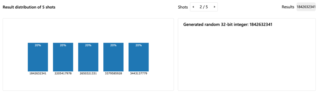 在编辑器的下面有运行按钮,并且可以指定运行的次数。我们点击运行按钮来运行这段 Q# 代码。结果会显示在下方。