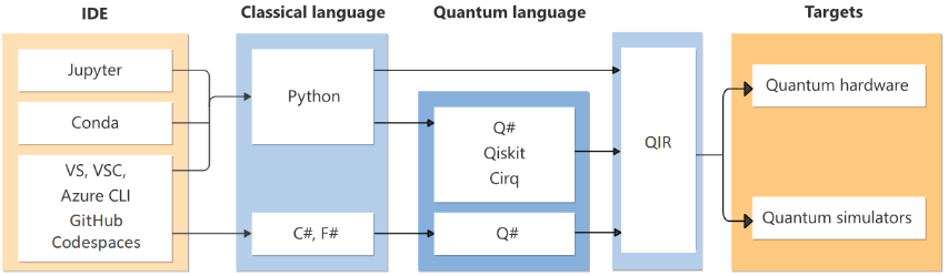 Q# 语言是一种高级开源编程语言,便于研究人员将工作重点放到算法和应用程序级别的实现,而不用太纠结于具体量子计算实现的细节。同时,Q# 隔绝了量子计算硬件(即量子计算机)不同实现的差异并支持离线的编程。尽管在一些具体计算实现上还存在差异,但基本上可以让编写的程序运行于不同的平台。Q# 是 QDK 的一部分,除此之外还包含了很多库,比如用于模拟量子动力学和电子结构的量子化学库、利用量子计算来实现顺序分类的量子机器学习库和广泛用于数字范畴的量子数值库等。