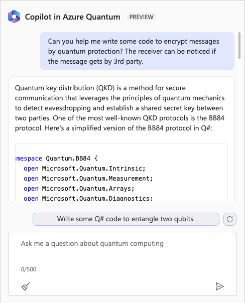 大致就是能否给我个示例代码,实现双方受到量子计算保护的安全通信。一旦消息被截获会收到通知。于是,Copilot 就给我了一段代码和说明。