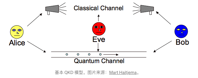BB84 协议是最早描述如何利用光子的偏振态来传输消息的。发送者(通常称为 Alice)和接收者(通常称为 Bob)用量子信道来传输量子态。如果用光子作为量子态载体,对应的量子信道可以是光纤或者简单的自由空间。另外他们还需要一条公共经典信道,比如无线电或因特网。公共信道的安全性不需考虑,BB84 协议在设计时已考虑到了两种信道都被第三方(通常称为 Eve)窃听的可能。因为基于海森堡不确定性原理,在量子系统中,只有一对共轭性质(如位置和动量)的一个性质是可以确定的(对粒子位置的合理测量会干扰其速度)。量子密码学利用了这一点,通过使用不同碱基上的光子偏振(因为光子可以通过光纤链路交换)作为共轭特性。当 Eve 截获量子密钥时,基于无克隆定理,即不可能创建未知量子态的相同副本,就可以发现是否中断了量子通道。