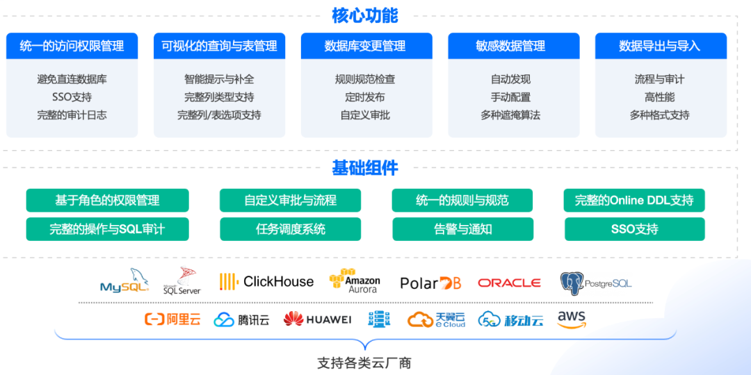 权限分散、审计欠缺,安全管控难度大 ; 各个工具建设程度不一,体验一般,开发效率低; 无法形成统一规范,数据库生产稳定性缺乏保障; 多环境、多种数据源无法统一管理。