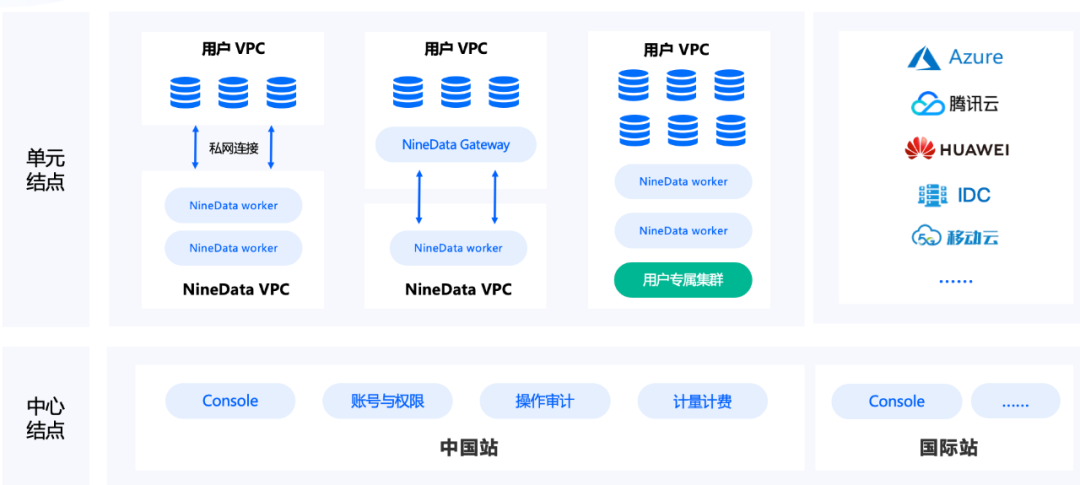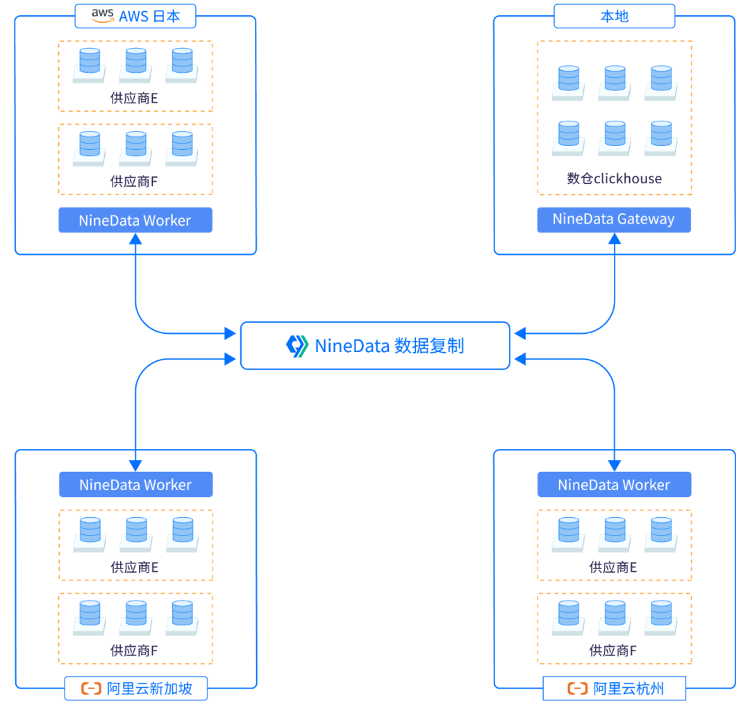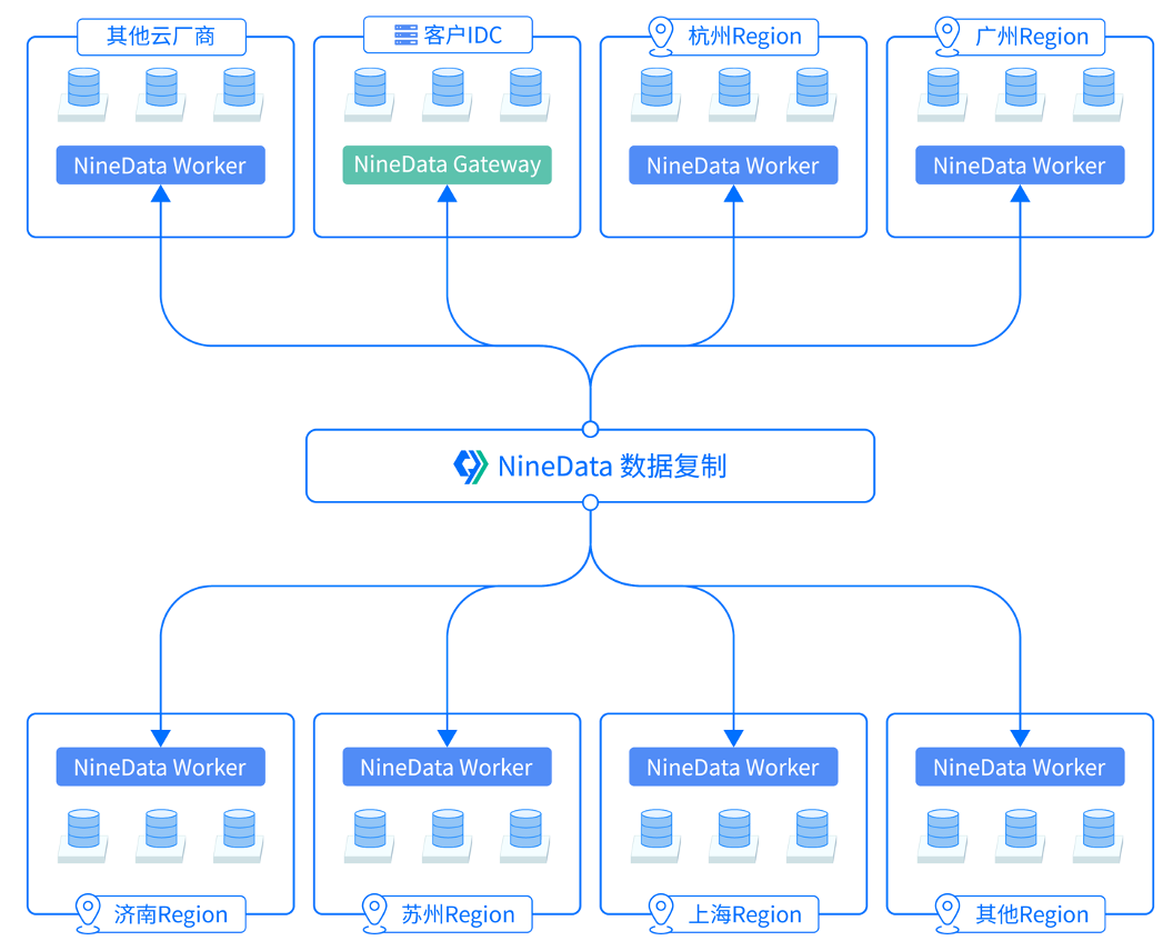 某大型国资云数据复制,客户全国有30+Region,本身有很多数据需要同步,同时还要提供数据复制产品给他的客户使用,比如该云的客户从其他云厂商或自建系统中迁移上云。包括很多复杂的应用场景,如迁移上云、跨云迁移、跨区域迁移、数据容灾、异地多活等业务场景。也面临非常复杂的网络环境,Region内部/Region之间,和其他云厂商与客户自有系统之间等各种链路。客户在考察了市面上主流云厂商、数据复制专门厂商的方案后选择了NineData。