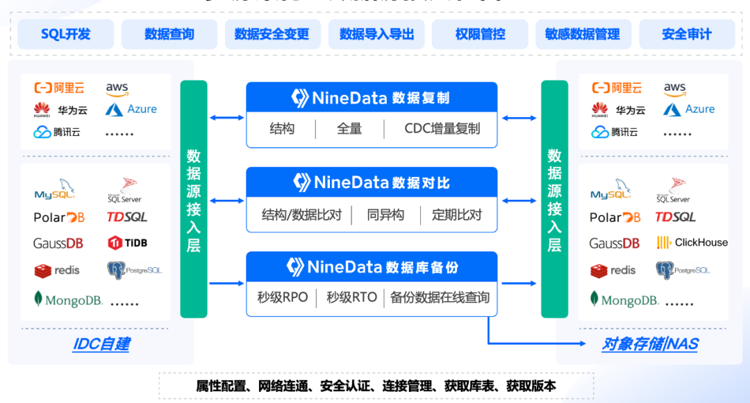先介绍下NineData整体架构,基于多云和多源能力,我们构建了数据备份、数据复制、数据对比和SQL开发能力。