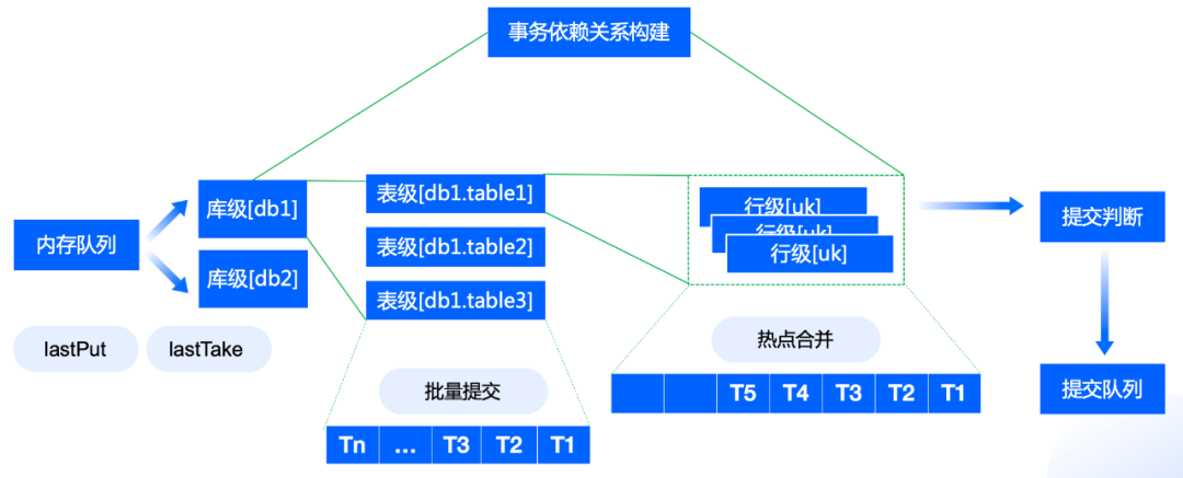 第二个抓取和写入模块的插件化,最大程度复用代码,提升产品化效率和稳定性。我们提供了一个叫做关系数据提交框架。该框架把DDL/DML的库、表、主键级别冲突等待,事务冲突等待,热点合并和攒批优化SQL都抽象出来,使得后面接入的数据源可以天然地具备这些能力。