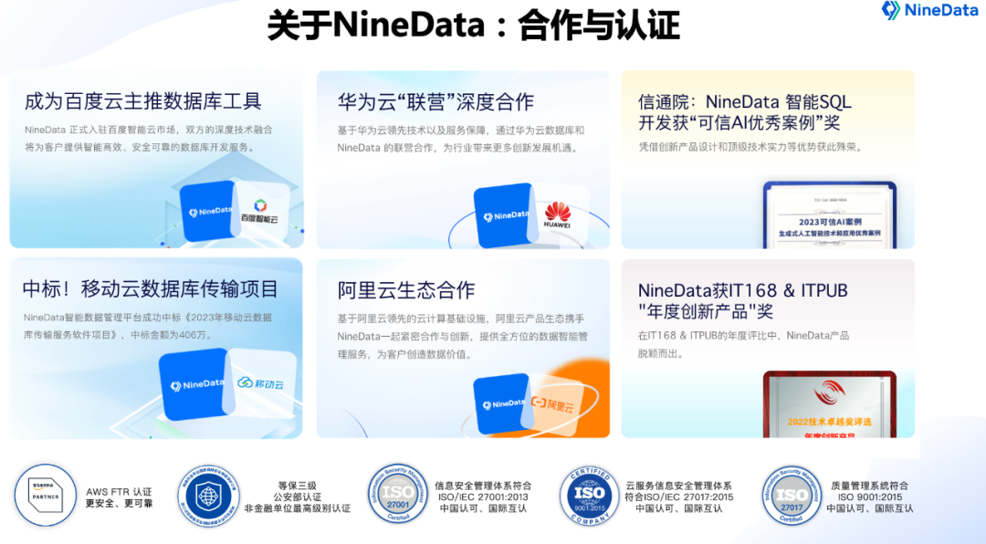 最后,NineData 已经和数据源、云厂商产生了很多密切的合作关系,并且取得云服务、信息安全管理、质量管理等多项认证,在多个行业的头部企业中广泛应用。NineData 致力于为客户提供更加稳定、更智能的数据库服务,帮助客户快速构建统一的数据管理,让每个人用好数据和云,欢迎大家体验使用。