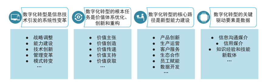 数字化转型是顺应新一轮科技革命和产业变革趋势,不断深化应用云计算、大数据、物联网、人工智能、区块链等新一代信息技术,激发数据要素创新驱动潜能,打造和提升信息时代的生存与发展能力,加速业务优化升级和创新转型,改造提升传统动能,培育发展新动能,创造、传递并获取新价值,实现转型升级和创新发展的过程。数字化价值效益按照业务创新转型方向和价值空间大小可分为生产运营优化、产品 服务创新和业态转变三大类。生产运营优化。基于传统存量业务,价值创造和传递活动主要集中在企业内部价值链,价值获取主要来源于传统产品规模化生产与交易,通过数字化转型促进成本降低与质量提高。产品 服务创新。业务体系总体不大变,专注于拓展基于传统业务的延伸服务,价值创造和传递活动沿着产品 服务链延长价值链,开辟业务增量发展空间,价值获取主要来源于已有技术 产品体系的增量价值。业态转变。业务体系颠覆式创新,专注于发展壮大数字业务,价值创造和传递活动由线性关联的价值链、企业内部价值网络转变为开放价值生态,价值获取主要来源于与生态合作伙伴共建的业务生态。价值体系优化、创新和重构是数字化转型的根本任务,参考 T/AIITRE 10001-2020《数字化转型:参考架构》,中央企业应从发展战略、新型能力、解决方案、治理体系和业务创新五个视角出发,构建系统化、体系化的关联关系,系统有序地推进数字化转型,创新价值创造、传递、支持、获取的路径和模式。