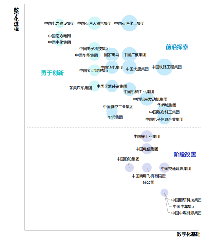前沿探索:处在这一区域的企业拥有较好的信息化基础,并且在数字化方面布局得比较早。在这一象限中,能源类企业占比最高,为42.9%。其次为制造类企业,占比28.6%。阶段改善:处在这一区域的企业拥有较为扎实的信息化基础,且在数字化转型进程上取得了一定的阶段性成果。其中,制造类企业占比为50%,能源类企业占比为25%。勇于创新:处在这个区域的企业在一定程度上采取较为激进的方式,跳过了信息化阶段向数字企业过渡。这一象限中,能源类企业占比最高,为62.5%。其次为制造类企业,占25%。国资委在发布的《关于加快推进国有企业数字化转型工作的通知》中,明确了制造、能源等四类企业的转型示范样板,央企在推进数字化转型时,可对其进行参考。中国海油积极推动数字化转型工作,正式发布了《中国海油数字化转型顶层设计纲要》和《智能油田顶层设计纲要》,2020 年,集团公司召开“数字化转型、智能化发展”专题座谈会,进一步明确了数字化转型的方向和路径,并从以下四个方面开展数字化转型实践。