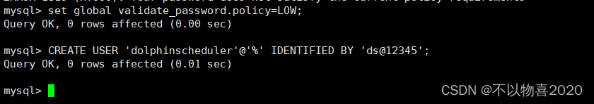 # 修改 {user} 和 {password} 为你希望的用户名和密码mysql> CREATE USER '{user}'@'%' IDENTIFIED BY '{password}';mysql> GRANT ALL PRIVILEGES ON dolphinscheduler.* TO '{user}'@'%';mysql> CREATE USER '{user}'@'localhost' IDENTIFIED BY '{password}';mysql> GRANT ALL PRIVILEGES ON dolphinscheduler.* TO '{user}'@'localhost';mysql> FLUSH PRIVILEGES;