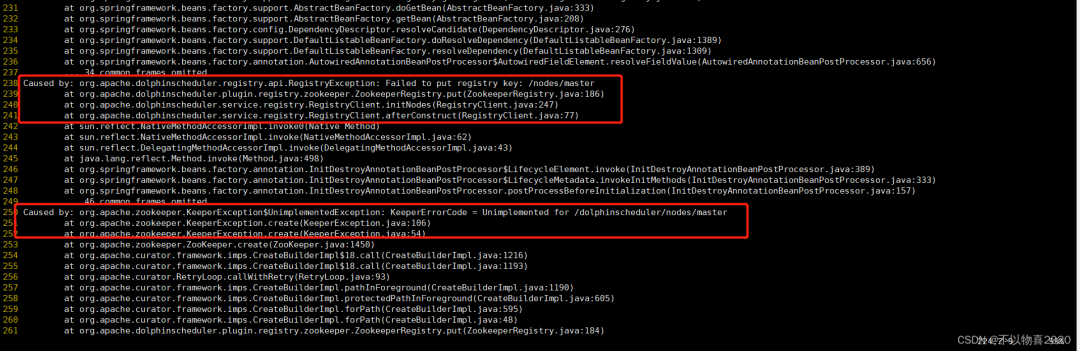 Caused by: org.apache.dolphinscheduler.registry.api.RegistryException: Failed to put registry key: nodes/master239 at org.apache.dolphinscheduler.plugin.registry.zookeeper.ZookeeperRegistry.put(ZookeeperRegistry.java:186)240 at org.apache.dolphinscheduler.service.registry.RegistryClient.initNodes(RegistryClient.java:247)241 at org.apache.dolphinscheduler.service.registry.RegistryClient.afterConstruct(RegistryClient.java:77)242 at sun.reflect.NativeMethodAccessorImpl.invoke0(Native Method)243 at sun.reflect.NativeMethodAccessorImpl.invoke(NativeMethodAccessorImpl.java:62)244 at sun.reflect.DelegatingMethodAccessorImpl.invoke(DelegatingMethodAccessorImpl.java:43)245 at java.lang.reflect.Method.invoke(Method.java:498)246 at org.springframework.beans.factory.annotation.InitDestroyAnnotationBeanPostProcessorL i f e c y c l e E l e m e n t . i n v o k e ( I n i t D e s t r o y A n n o t a t i o n B e a n P o s t P r o c e s s o r . j a v a : 389 ) 247 a t o r g . s p r i n g f r a m e w o r k . b e a n s . f a c t o r y . a n n o t a t i o n . I n i t D e s t r o y A n n o t a t i o n B e a n P o s t P r o c e s s o r LifecycleElement.invoke(InitDestroyAnnotationBeanPostProcessor.java:389) 247 at org.springframework.beans.factory.annotation.InitDestroyAnnotationBeanPostProcessorLifecycleElement.invoke(InitDestroyAnnotationBeanPostProcessor.java:389)247atorg.springframework.beans.factory.annotation.InitDestroyAnnotationBeanPostProcessorLifecycleMetadata.invokeInitMethods(InitDestroyAnnotationBeanPostProcessor.java:333)248 at org.springframework.beans.factory.annotation.InitDestroyAnnotationBeanPostProcessor.postProcessBeforeInitialization(InitDestroyAnnotationBeanPostProcessor.java:157)249 … 46 common frames omitted250 Caused by: org.apache.zookeeper.KeeperException