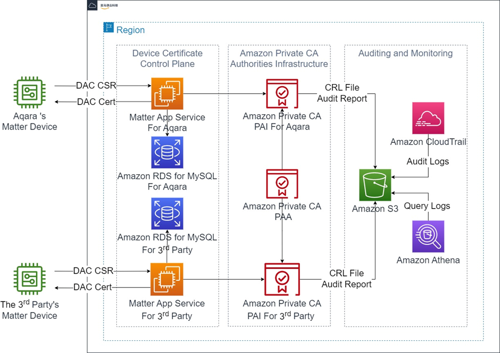确保 Matter PKI 体系的安全性是 Aqara 和 Amazon Private CA 的共同责任。Amazon Private CA 服务运行所依托的设备物理安全性的各个环节,都由亚马逊云科技进行运营、管理和控制,Aqara 只承担使用 Amazon Private CA 的相关责任和管理工作,如逻辑访问控制和其他技术设置(比如加密、日志、日志数据备份)等。这种责任共担模型大幅简化和减轻了 Aqara 的运营负担。