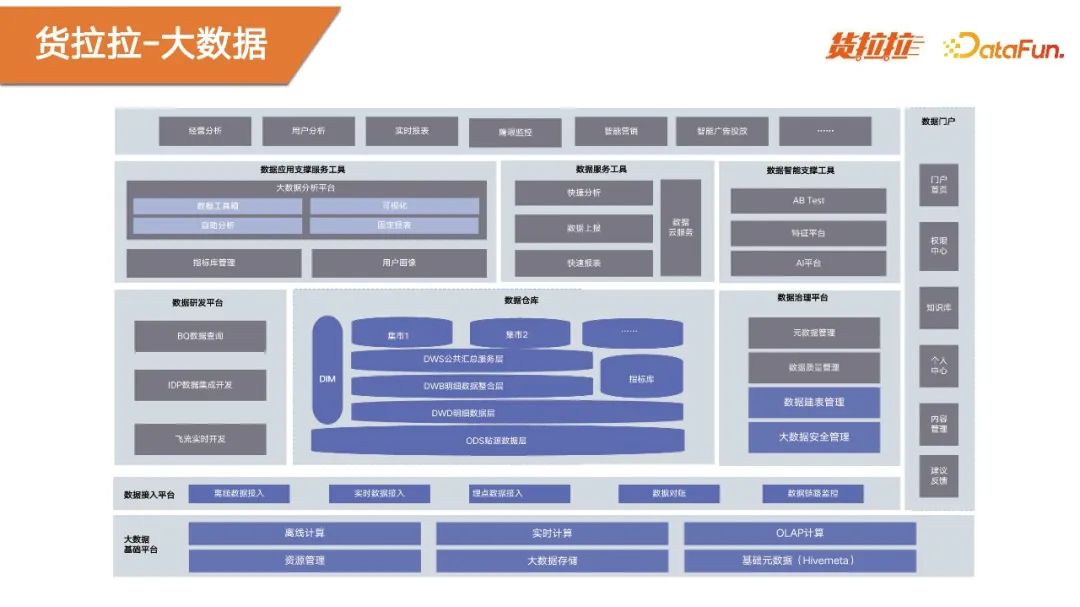 自下而上来看,首先是基础层和数据接入层,主要提供的是数据计算、存储以及集群管理。往上是数据研发和数据仓库,主要提供数据研发能力。接着是具备业务属性的应用层和服务层。整个体系,自下而上相互支撑,最终实现支撑业务和赋能业务。