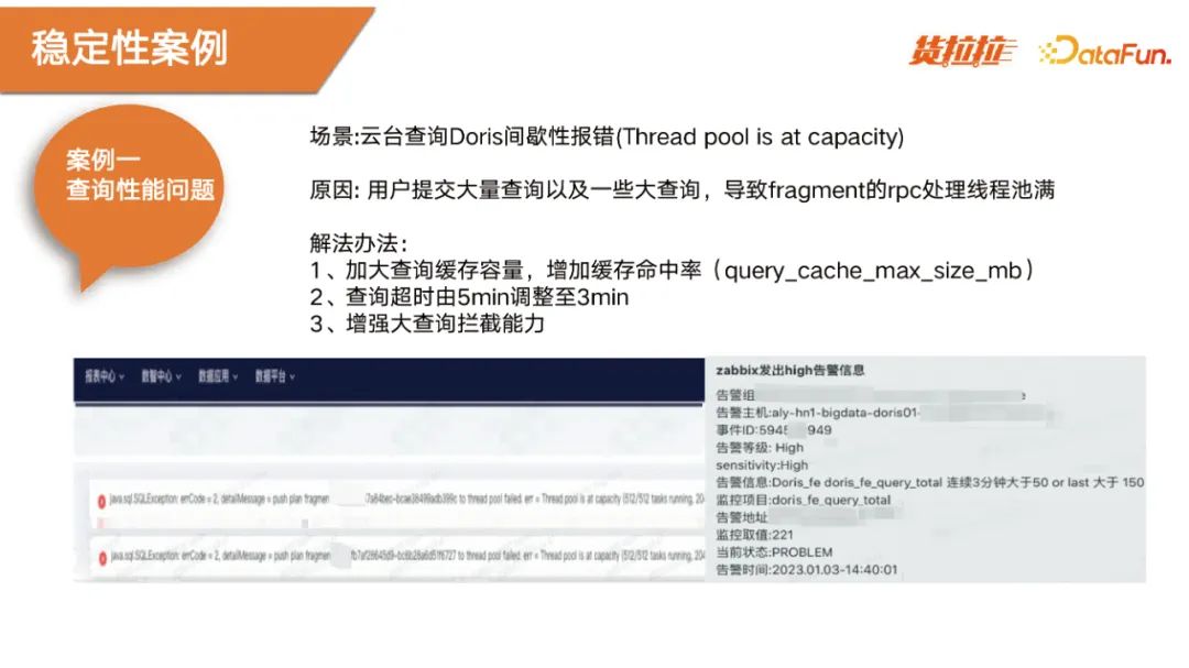 场景是云台查询Doris间歇性报错。我们定位的原因是用户提交了大量的查询,以及一些大查询,导致fragment的rpc处理线程池满。目前的处理办法是加大缓存容量,增加缓存命中率。另外,将查询时间下调,同时增加大查询的拦截能力。
