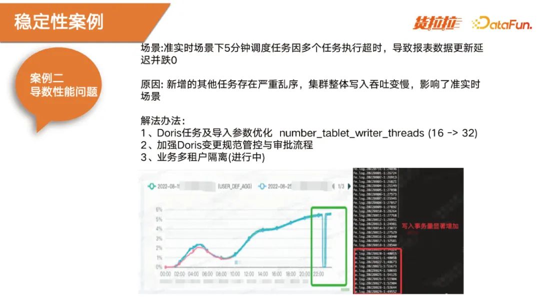 在一个准实时场景下,5分钟调度任务因多个任务执行超时,导致报表数据更新延迟并跌0。原因是业务方提交了其他任务存在严重乱序,导致集群的整体写入吞吐变得很慢,影响了准实时场景。我们的解决方法是,将Doris任务及导入参数进行了优化。同时,加强了Doris变更规范管控与审批流程,并正在实现业务多租户的隔离。