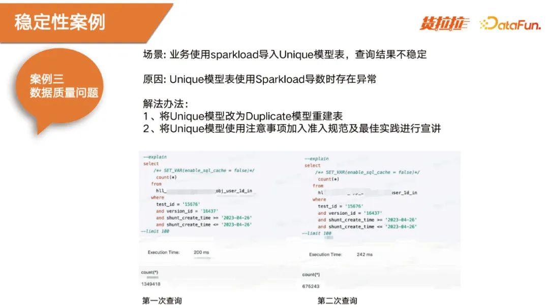 业务使用Sparkload导入Unique模型表,查询结果不稳定,导入的数据和查询的结果不一样。原因为Unique模型表使用Sparkload导数时存在异常。目前是采取规避的方法去解决,首先是将Unique模型改为Duplicate模型重建表,并进行任务的重写;另外,将Unique模型使用注意事项加入准入规范及最佳实践进行宣讲。