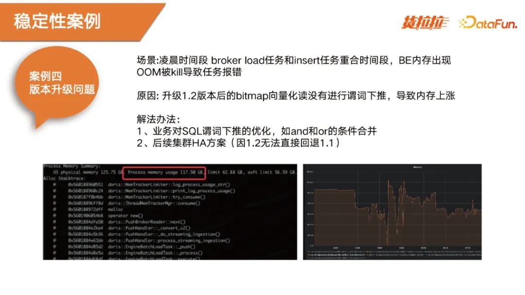 从1.1升级到1.2,在任务高峰期内存出现OOM被kill,导致任务报错。原因是升级后的bitmap向量化没有进行谓词下推,也就是过滤条件没有提前执行,导致内存上涨。目前的解决办法是业务对SQL谓词下推进行了优化,如and和or的条件合并。后续会考虑集群HA方案。