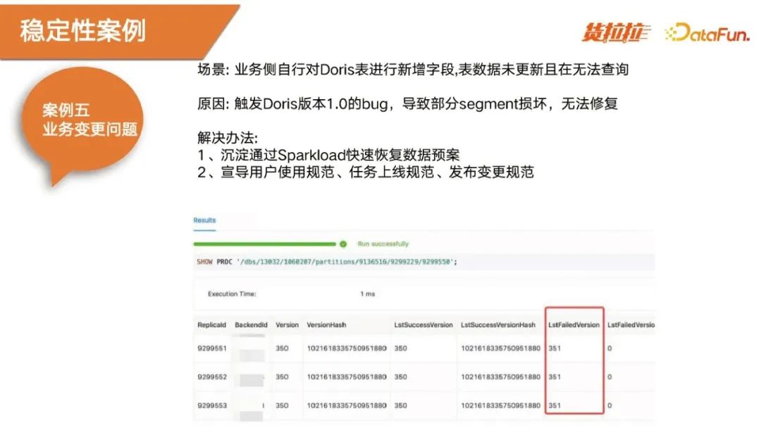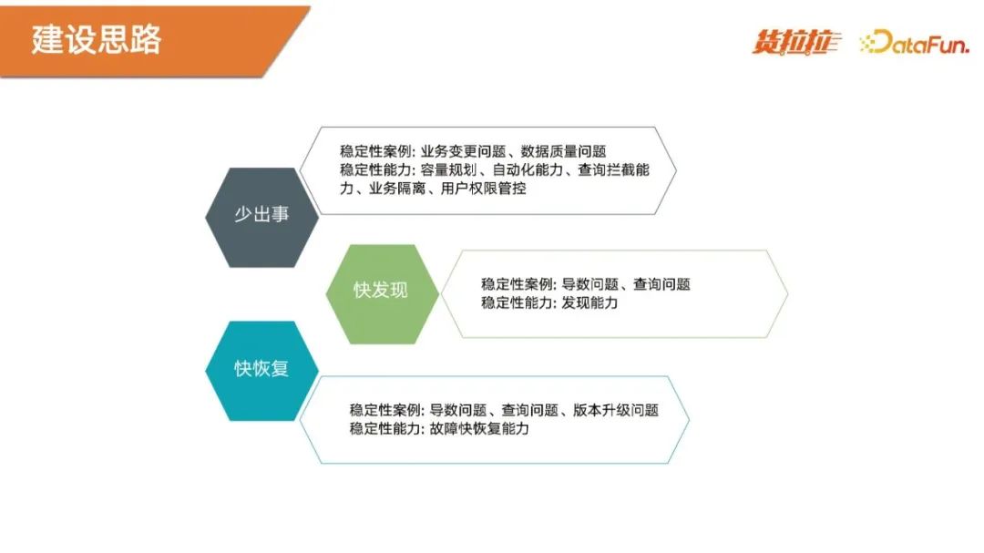 业务侧自行对Doris表新增字段,导致分区无法查询。原因定位为触发了Doris版本1.0的bug,导致部分segment损害,无法修复。针对这一问题,我们沉淀了一个通过Sparkload快速恢复数据的应急预案。并对用户宣导,遵守使用规范、任务上线规范和发布变更规范,避免类似问题的再次发生。2. 稳定性建设思路