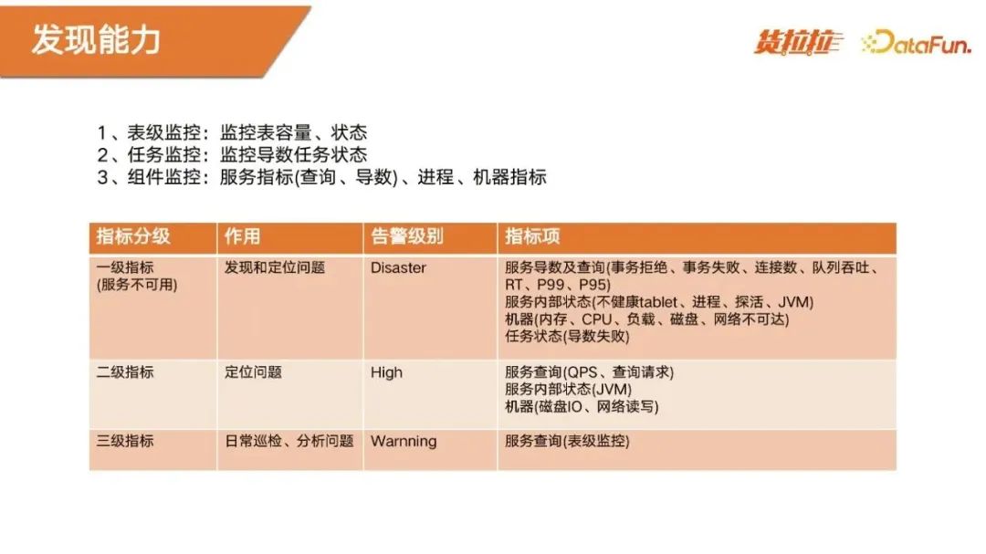◆ 组件监控,针对服务指标(如查询、导数)、进程和机器指标进行监控。我们对指标也进行了分级,一级指标表示服务不可用,用于发现和定位问题;二级指标和三级指标用于日常定位问题和分析问题。