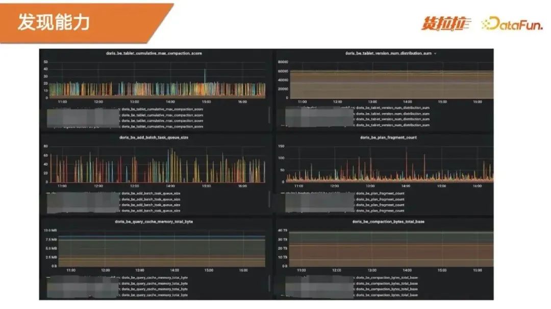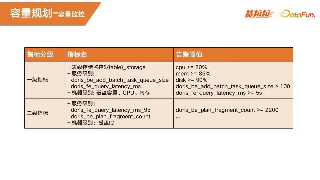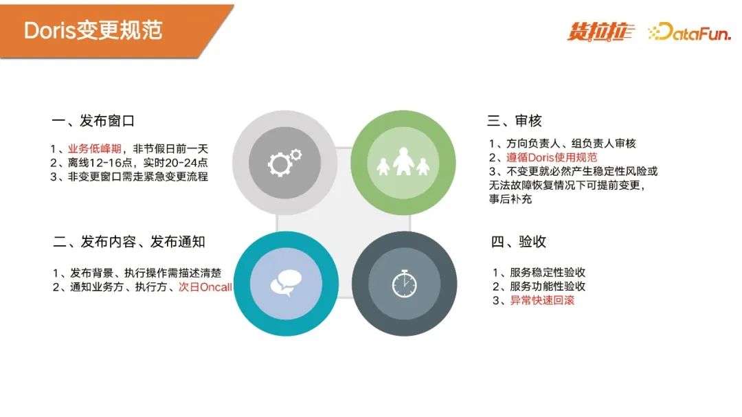 Doris变更规范,主要涉及的操作包括:Doris集群本身的变更,比如集群配置的修改、集群重启、集群版本升级等;还有一些业务侧的变更,比如新建表、新添加导出链路、表和字段的修改等等。首先是业务变更的时间窗口,通常会选择在业务低峰期进行变更。当然紧急的变更需求也可以走紧急变更流程。第二是发布内容和发布通知,对发布背景和执行操作要进行清楚地描述,同时要充分地通知到业务方和执行方,保证次日Oncall。第三是由方向负责人和组负责人进行审核,遵循Doris使用规范。最后,验收阶段,分为服务功能性验收和服务稳定性验收,针对异常能够做到快速回滚。04
