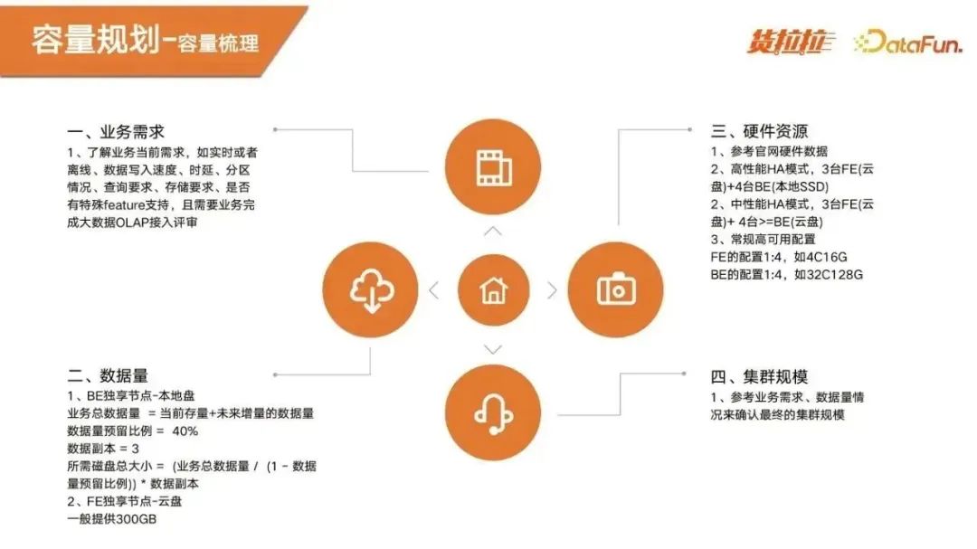 容量梳理包含业务需求、数据量、硬件资源和集群规模几大部分。通过业务需求,确定当前的场景是实时还是离线,数据写入速度,分区情况,以及查询、存储的要求等等。同时根据当前的业务需求需要的数据量,拟定当前的硬件资源,以及集群规模。生产环境集群资源配置,FE(云盘)和BE(本地) CPU和内存比是1:4的机型这种机型使用。这种在当前环境有较高的资源利用率。在需要较高的吞吐情况下,使用本地IO高吞吐的磁盘。