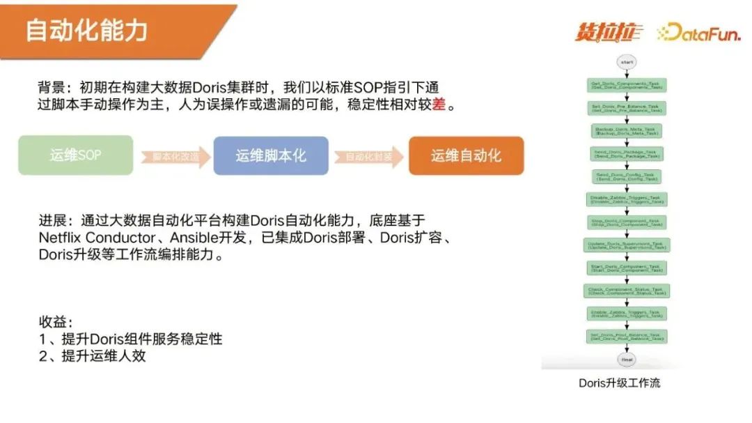 通过大数据自动化运维平台构建了大数据自动化能力,底座基于Conductor和Ansible进行开发。目前已集成了Doris部署、扩容、升级等工作流编排能力。提高了Doris组件服务运维的稳定性,提升了运维人效。7. 其他保障能力