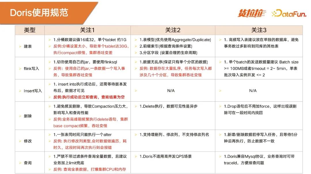 当我们接收到一个新的需求时,首先要进行需求评估,判断是否适合Doris。我们会按照业务稳定性要求、导数、存储等多个维度进行综合考量。导数部分,通过Flink和streamload的方式将数据写入Doris,为了提升性能,会将数据累计到150M做批次导入,写入延迟通常在秒级。对写入延迟比较高的场景,要求在毫秒级的,不太适用。目前的版本是存算一体的架构,存储成本相对较高,对于大容量的业务,出于成本的考虑也并不适用。数据量比较小的场景,推荐直接使用MySQL。查询QPS方面,对于端上的查询QPS要求几千或者上万,不推荐使用Doris。对于风控的业务,对查询的响应要求非常高,也不适合Doris,会推荐使用HBase。后续参加需求准入的评审,主要评估业务的价值,综合评价投入产出比。2. Doris使用规范