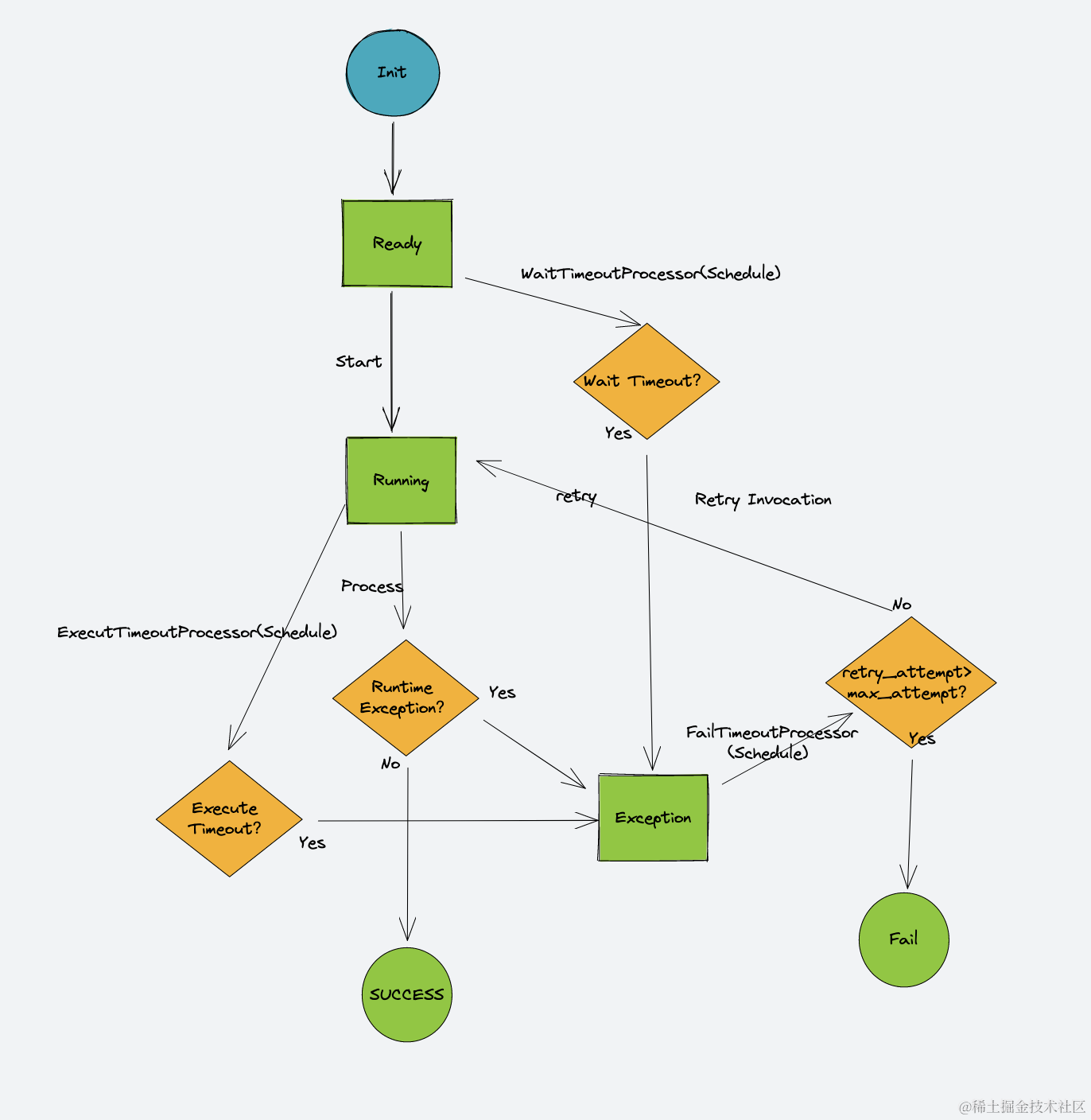 - 为了处理可能的机器重启、掉电等场景,我们引入了额外的定时器处理对READY和RUNNING状态下的超时情况进行监控,如果在这两个状态发生超时,那么直接转入EXCEPTION或FAIL状态。
