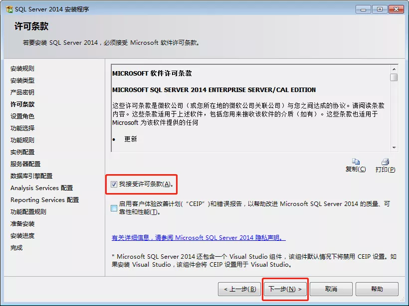 4、勾选“我接受许可条款(A)”,点击“下一步”;