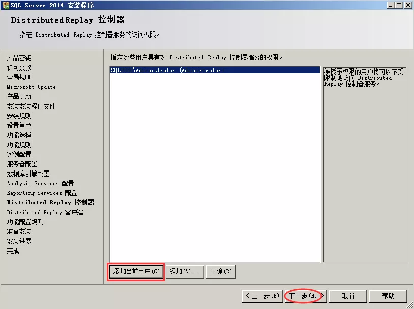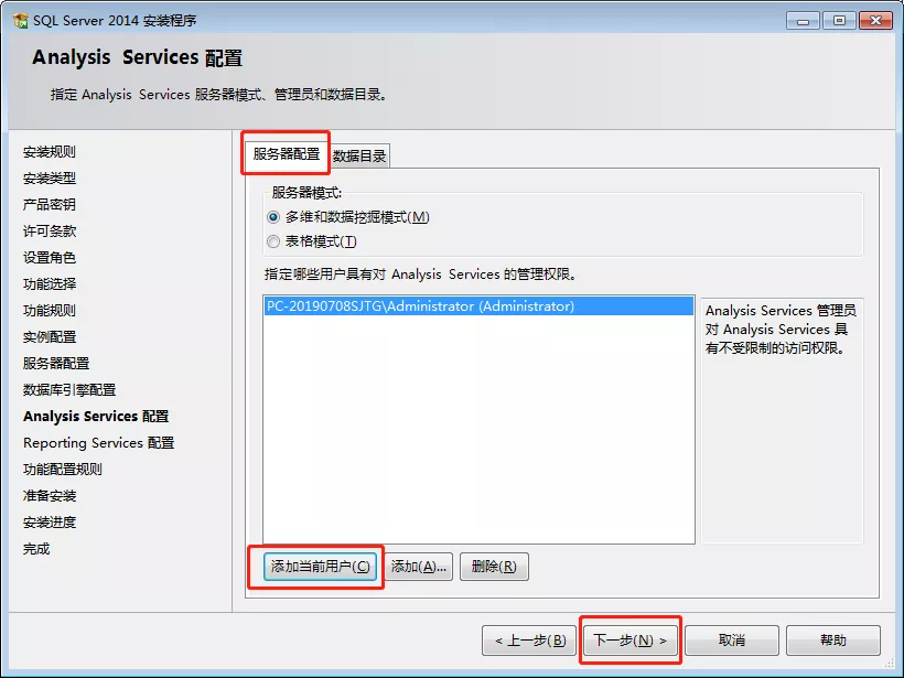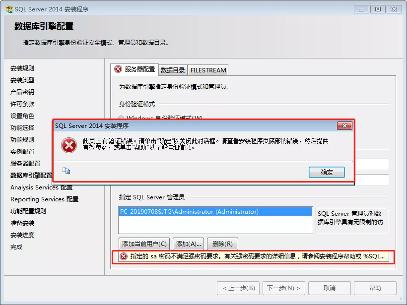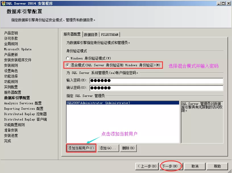 9、选择混合模式并输入sa系统管理员登录密码(密码复杂度有校验,建议输入比较复杂的密码,至少包含数字、英文字符、特殊符号、不少于8位等),不然点击下一步时安装报错,点击“添加当前用户”;
