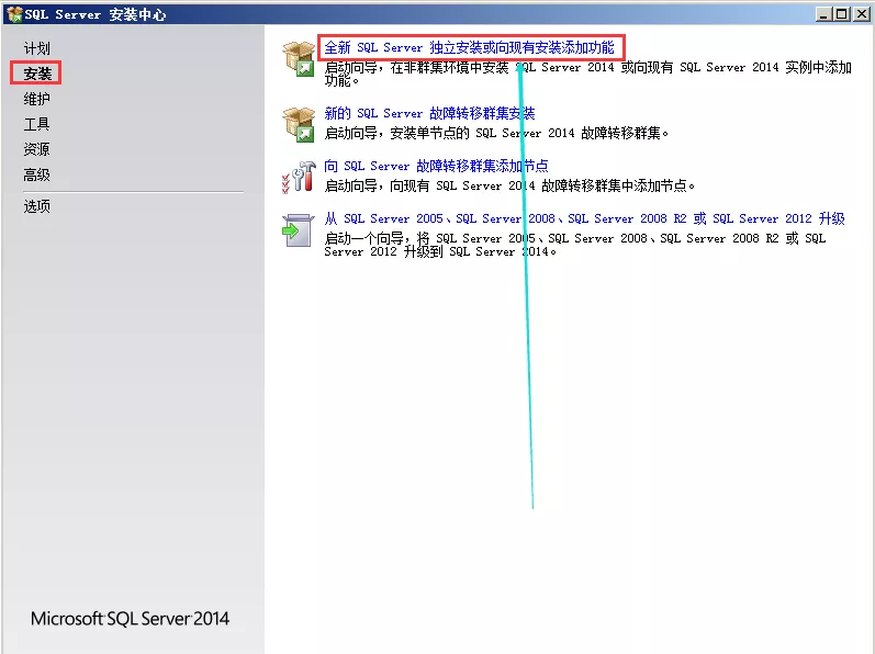 2、点击安装界面左侧“安装”选项,然后点击右侧第一个“全新SQL Server独立安装或向现有安装添加功能”选项;