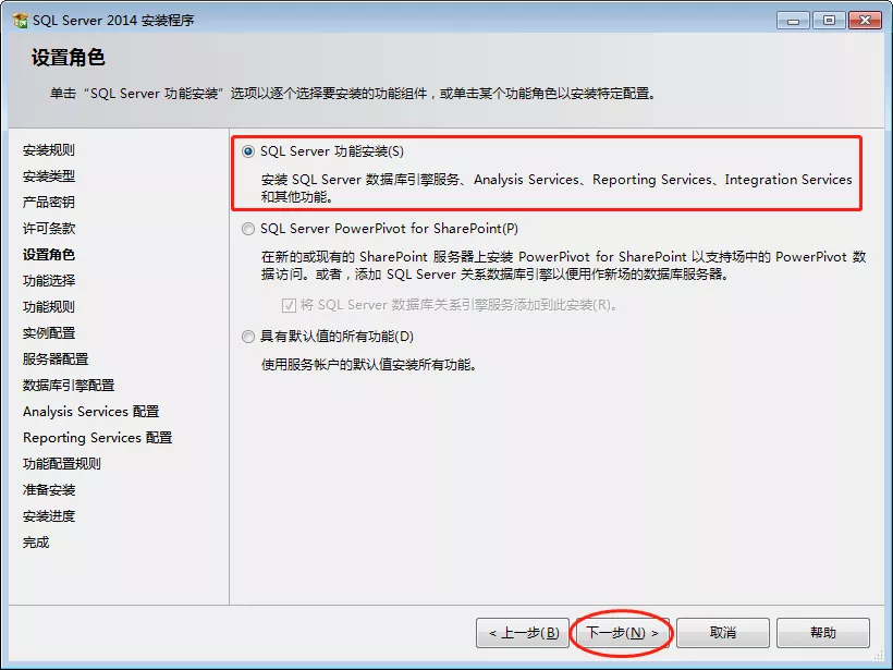 5、默认选择“SQL Server功能安装”,点击“下一步”;