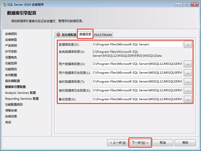 10、单击“数据目录”选项,可查看数据存储位置,也可进行更改,我们现在选择默认就行,(建议直接默认,安装完成后,仍可进数据库设置进行自行调整),点击“下一步”;
