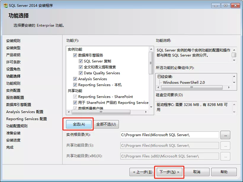 6、点击“全选”所有功能,目录全部默认即可,再点击“下一步”;