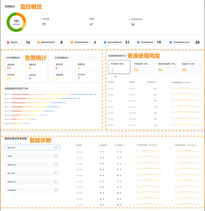 数据库全景大盘首先要依赖全链路、全方位的监控。数据库的可观测能力对于数据库的运维十分重要,GaussDB全链路监控具备从硬件、OS、DB等分层监控,构建从采集、发送、展示、分析到巡检等全链路能力,并且打通了硬件到操作系统,到数据库整个监控链的通道。比如说硬件出现故障问题,如果在云上,硬件故障属于不同部门维护,数据库部门只能看到数据库集群,如何感知到硬件发生亚健康或者操作系统存在问题,这个时候就得联合硬件部门,打通硬件到操作系统、数据库的通知机制,如果在这层发生了亚健康问题,可以把故障信息向上通知相关的运维部门解决。