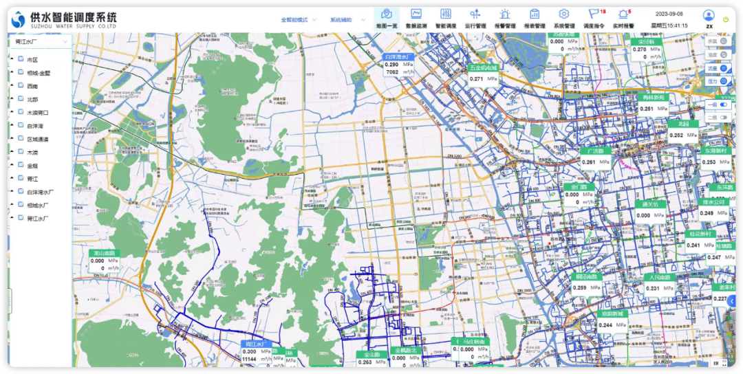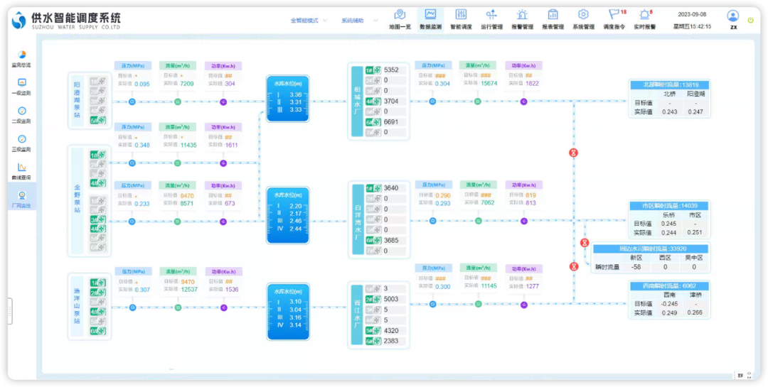 出厂压力设定:通过对监测点数据与压力控制目标/标准的比对,设定算法自动进行出厂压力设定调整,每次可调0.3m,使压力调整更为平顺。分析各个水厂近一年运营的海量历史数据,并结合各个水厂的实时电耗和药耗成本数据,制定厂间水量动态负荷分配策略。