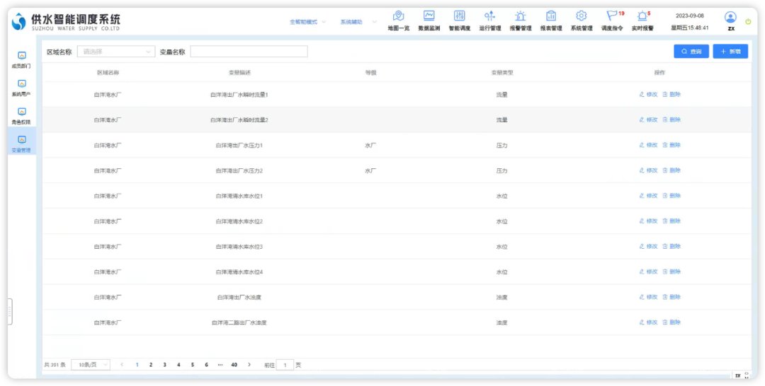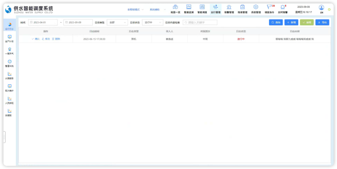 运行管理:通过运控人员日常工作排班、运行日志、交接班的管理,可灵活对接帆软报表生产计划和水质报告,方便数据统计和分析;对接OA系统记录日常管道冲洗和停水公告,还可支持一周天气查询,方便运行管理。