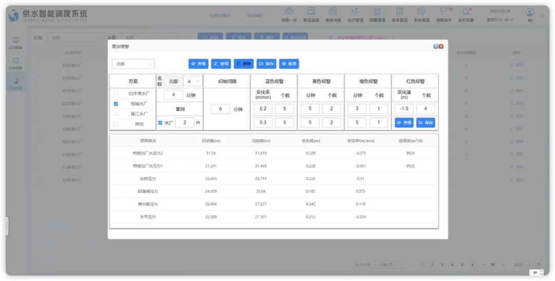 报警管理:包含智能预警、异常处理、报警查询、单点报警、多点联动报警、实时报警、历史记录、地图跳转等内容,通过数据挖掘来预测运行状况,并实现报警管理的智能化,以便及早采取相应措施。能够及时发现和处理运行异常情况,实时报警自动弹窗展示,与水厂智能控制指令进行智能联动报警,减少误报警。