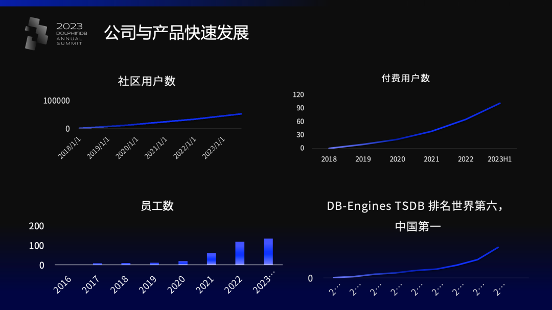 2016年的时候,我们三人全职投入到了 DolphinDB。2018年底的时候,我们收获了第一个付费客户。截至8月份,我们已经有超过130位员工,付费客户超过100个,国内外社区用户的数量以每周300多的人数在快速增加,DB-ENGINES 时序数据库榜单的排名也上升到了国际第6,国内第1。DolphinDB 的快速成长,离不开国内大资管行业规模的高速增长,更离不开在座的各位用户对 DolphinDB 的支持与厚爱, 谢谢大家!