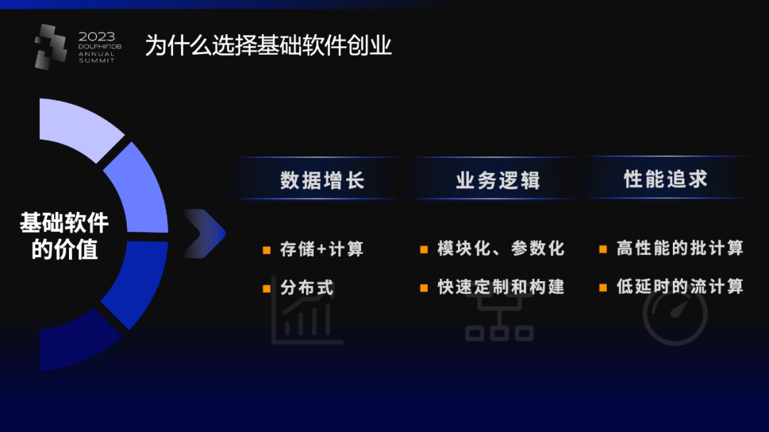 周博士讲述了自己的创业故事,从时代发展视角为大家分享选择金融领域基础软件进行创业的初衷。DolphinDB 作为一款基于高性能时序数据库,支持复杂分析和流数据处理的实时计算平台,其根本定位始终是开放的企业级基础软件。与金融行业深度融合的差异化策略,让 DolphinDB 在短短六七年的发展时间中,收获了大量用户的认可。