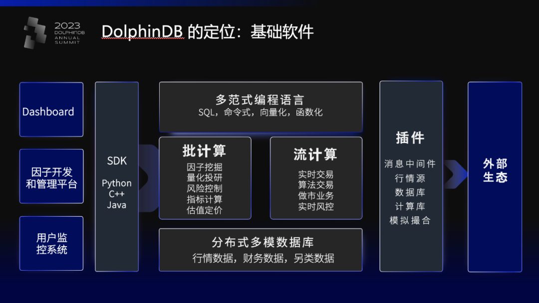 我们从设计产品的第一天开始,就明确一定要把基础软件与金融行业的需求深度的融合起来,真正去释放金融 IT 的生产力。有人是拿着锤子到处找钉子,我们是对着钉子造锤子。我还记得当年团队讨论的一些结论:一定要充分利用金融数据的时序特性来提升存储效率,一定要做高可用来解决金融可靠性的强需求。一定要强化计算来提升业务价值,一定要提供丰富的函数库来适配金融业务,一定要有编程语言来满足金融计算的复杂性要求,一定要做流式增量计算来降低实盘业务的时延。