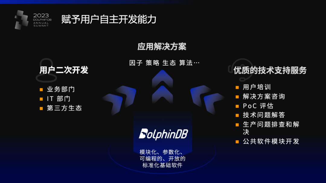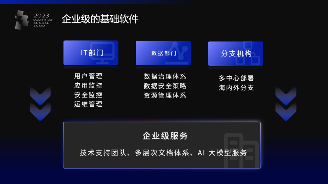 DolphinDB 定位一个企业级的基础软件,可以作为整个机构的基础设施。首先,DolphinDB 可以纳入一个机构IT部门全局的用户管理体系、应用监控体系、安全监控体系以及运维管理体系。其次,DolphinDB 可以融入企业的数据治理体系,数据安全策略,以及弹性的存储和计算资源管理体系。再次,DolphinDB 可以满足一个大型机构海内外分支机构的部署需要,以及异地多中心的部署。最后,一个企业级的基础软件,必须配套企业级的服务。DolphinDB 正在建设一个全方位的从生态、售前、售中到售后的专业的技术支持体系。DolphinDB 也正在完善从用户手册、教程案例、白皮书,最佳实践到用户问答的多层次的文档体系,并提供统一的搜索界面。我们也在和第三方合作开发私有的垂直大模型,在不久的将来提供更智能化、更高效的服务体系。