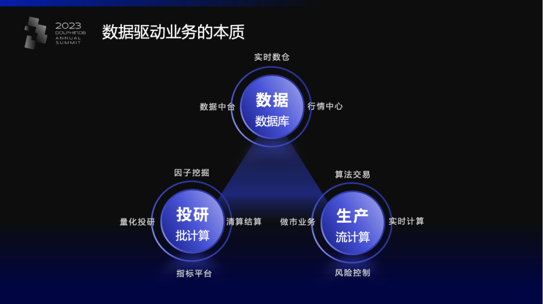 随着大数据和人工智能的发展,越来越多的金融业务开始启用数据驱动业务的模式。譬如量化交易、算法交易、做市业务、衍生品定价、风险控制、指标计算等都采用了这种模式。虽然具体业务不同,但本质上都是遵循了 数据-投研-生产 这个模式:收集和清洗大量历史数据,用历史数据建模,最后在生产实盘中进行模型推理和决策。这个模式背后对应的技术,则分别是数据库,批计算和流计算。与其它的基础软件只关注存储不同,DolphinDB 理解存储和计算并重对金融的重要性。DolphinDB 把这三个技术糅合在一个系统里,可以大大提升金融业务推进的效率。