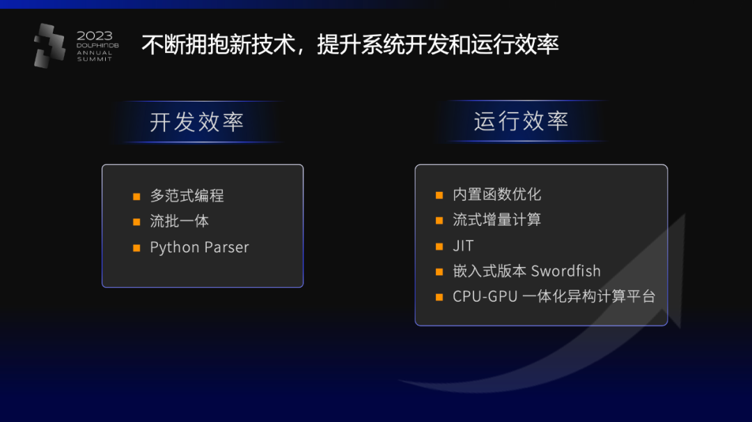 金融 IT 非常关注两个效率:系统开发效率与运行效率。DolphinDB 提拱了很多技术,来提升这两种效率。我们先来看 DolphinDB 如何提升系统开发效率:DolphinDB 引入了多范式编程语言,向量式、函数式、SQL 编程可以大大缩短开发时间;流批一体的技术,也可以大大缩短从研发到生产的时间。我们即将推出的 Python Parser,可以让用户将存量的 Python 代码无缝切换或稍加修改后快速切换到 DolphinDB 平台。