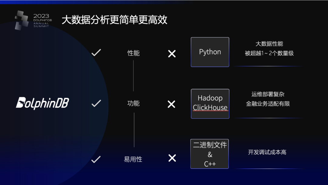 在 DolphinDB 之前,金融行业的大数据分析大致有3个生态,DolphinDB 与之相比,至少在性能、功能和易用性中的某一个维度有了大幅提升。Python 是用的最多的一个生态。Python 的 pandas 和 numpy 能够满足金融复杂数据分析的功能要求,但处理大数据时性能不够高,DolphinDB 的性能通常超越Python 1~2个数量级。第二个生态使用类似 Hadoop、ClickHouse 等大数据工具来解决。这类方案的主要是缺点是运维和部署的复杂度较高,对金融业务的适配比较有限。第三个生态主要来自于早期的量化私募。他们直接将金融数据存为私有的二进制文件格式,然后直接写 C++ 程序实现每一个数据分析。这种方式的缺点非常明显,开发和调试的成本太高;优点是性能优异。但在很多 PoC 测试过程中我们也发现,这些定制的分析程序,性能上并没有超越 DolphinDB 这种通用化的方案。